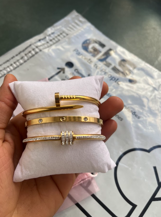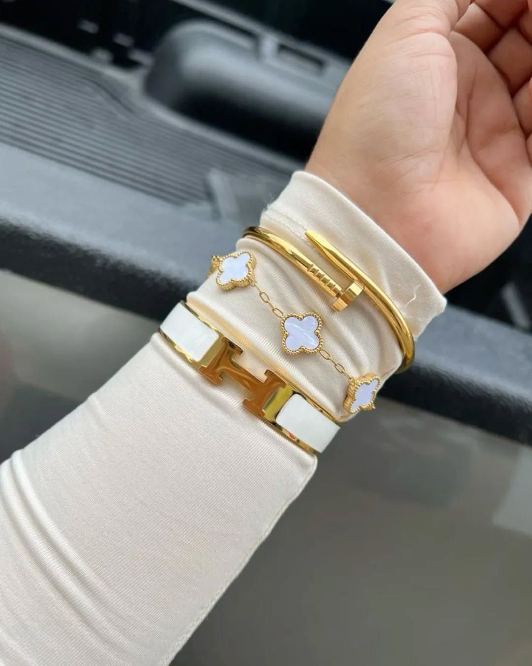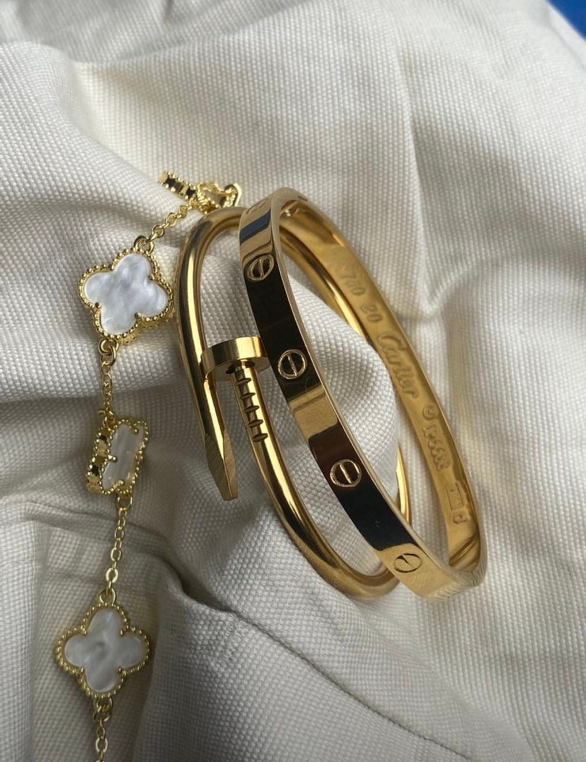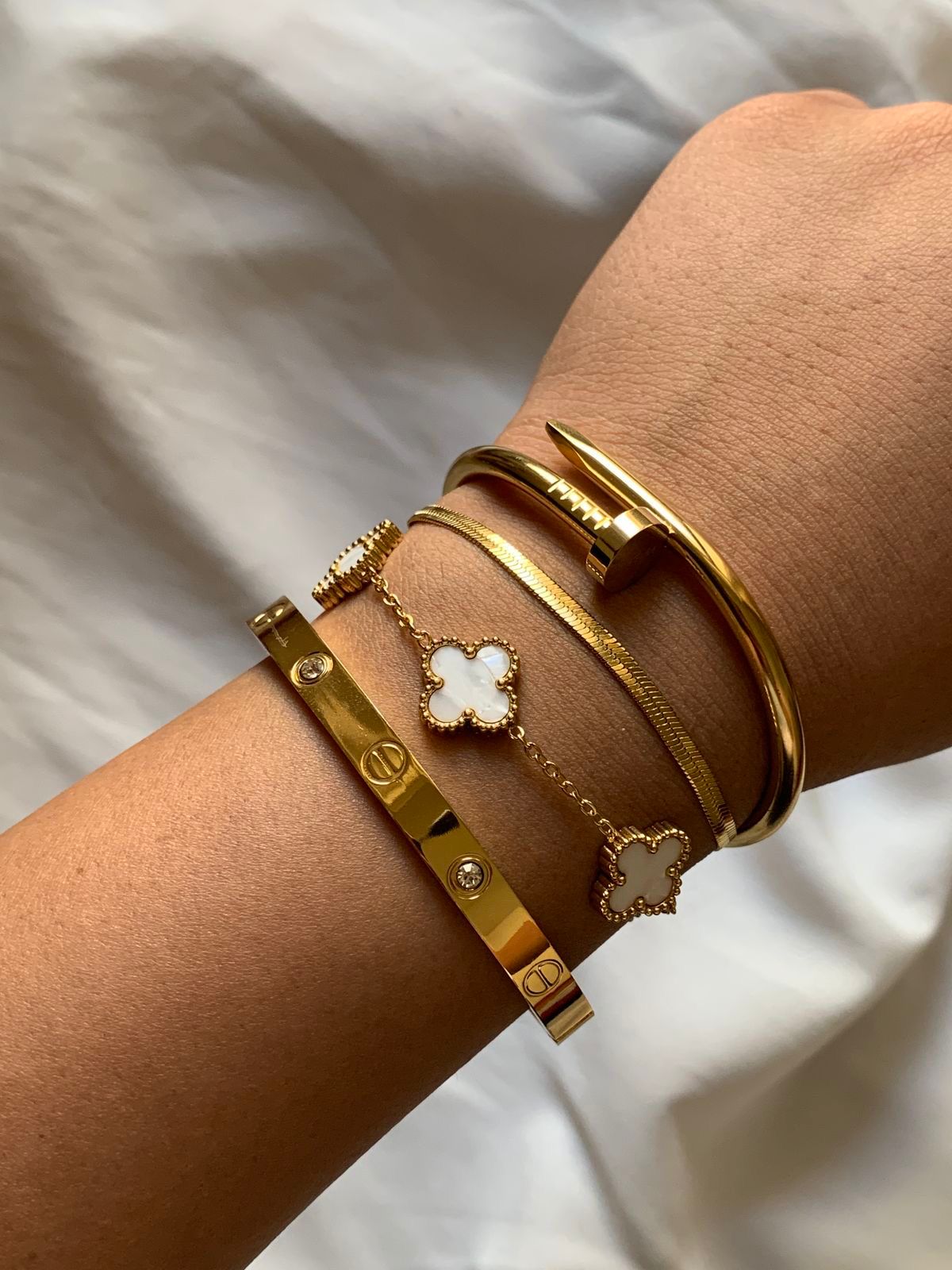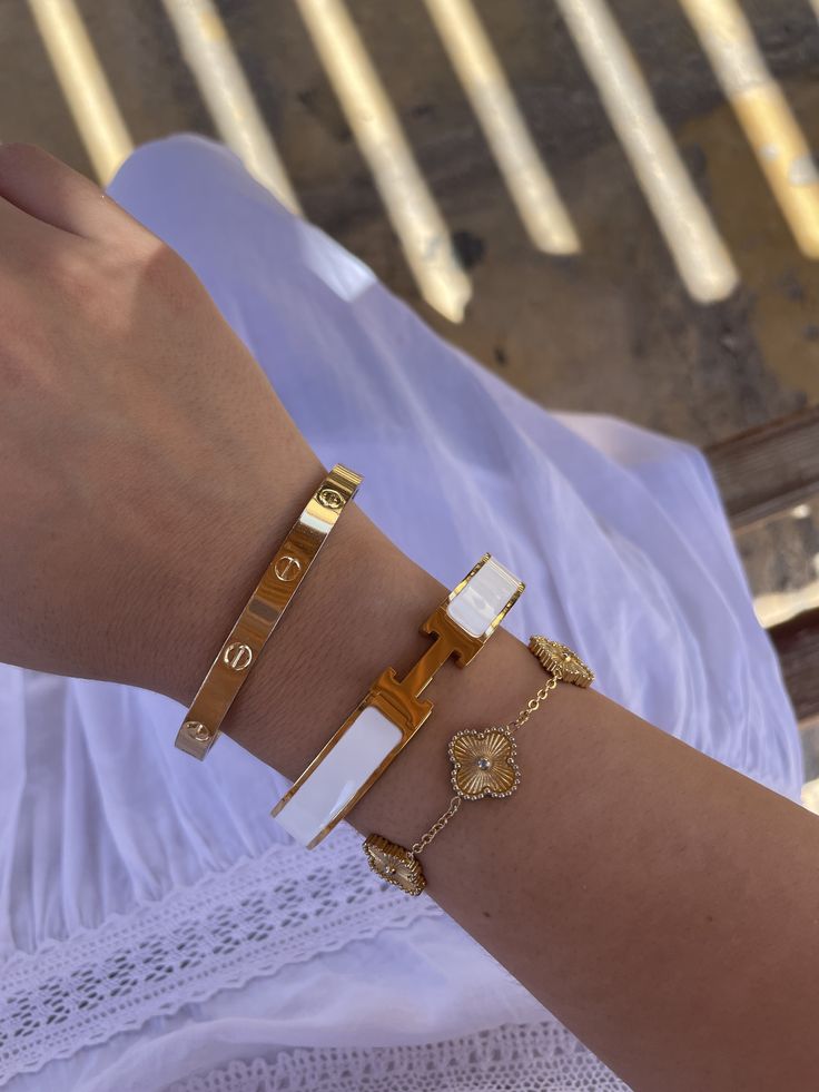 Nuestras pulseras están fabricadas en acero inoxidable hipoalergénico y chapadas en oro de alta calidad.